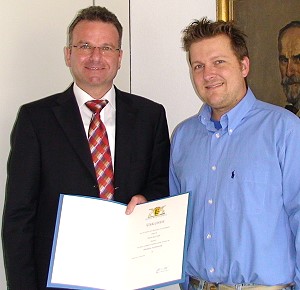 Ministerpräsident würdigt vorbildlichen Einsatz Kay Viehl (r.) bei der Überreichung der Urkunde durch Bürgermeister Bernhard Martin. (Foto:Richter)(hr) Am Abend des 4. Juni 2007 fiel ein kleines Mädchen, das mit seiner Mutter am Neckarufer in der Nähe der Eberbacher Bootsanlagestege unterwegs war, in den Fluss. Der Geistesgegenwart und dem Mut eines Mannes, der ins Wasser sprang und die Dreijährige an Land zog, verdankt das Kind sein Leben. Heute wurde Lebensretter Kay Viehl für seinen vorbildlichen Einsatz geehrt: Bürgermeister Bernhard Martin überreichte ihm eine Dankesurkunde von Ministerpräsident Günther Oettinger.