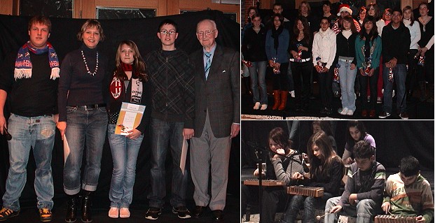 Förderpreise der Ehret-Stiftung vergeben Linkes Bild: Christopher Götz, Nicole Strämke, Ronja Fahrbach, Meikel Friedt und Helmut Ehret (v.l.). Rechts oben die Schülermentoren, rechts unten Schüler bei einer Musikdarbietung. (Fotos: Claudia Richter)(cr) Anlässlich der Winterfeier der Hauptschule mit Werkrealschule (HSWRS) in Eberbach wurden gestern in der Aula des Steige-Schulzentrums Förderpreise der Hedwig-und-Helmut-Ehret-Stiftung vergeben.