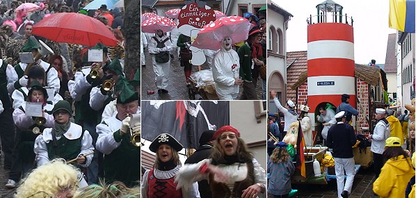 Nieselregen tat der Stimmung keinen Abbruch Links der Musikzug aus Heilbronn-Böckingen, Mitte oben Fliegenpilze aus Igelsbach, unten Piraten aus Rothenberg, rechts die Karnevalfreunde "Haidebow". (Fotos: Hubert Richter)Mehr Bilder (Klicken zum Vergrößern):