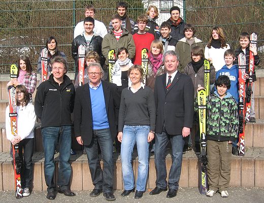 Lions-Club Eberbach übergibt zehn Paar Ski an HWRS v.l. Uwe Emig, Konrektor Richard Wurm, Rektorin Nicole Strämke, Rainer Empacher, Präsident des Lions-Club, mit Schülerinnen und Schülern der HWRS. (Foto: Nicole Kolbe)(ko) Skifahren als attraktive Sportart hat an der Haupt- und Werkrealschule in Eberbach eine lange Tradition. Seit 1990 nahmen bereits etwa 500 Schülerinnen und Schüler aus den 5.-10. Klassen an Skifreizeiten teil.