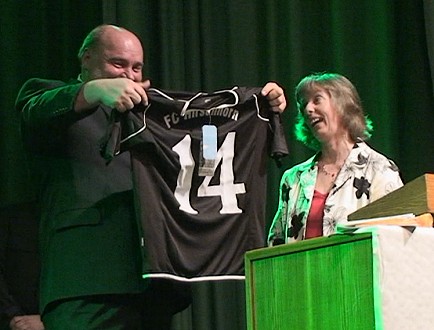 Nach der Pause, in der der FC seinen Gästen einen Imbiss servierte, ehrte Bürgermeisterin Ute Stenger gemeinsam mit Stadtverordnetenvorsteherin Dr. Irmtrud Wagner langjährige FCH-Aktive. Die Silberne Ehrennadel der Stadt Hirschhorn erhielten Peter Kaufmann, Karlheinz Enger (beide für 10 Jahre ehrenamtliche Vereinstätigkeit), Helmut Grab (11 Jahre), Klaus Albert (17 Jahre) und Jürgen Reinwald (18 Jahre). Mit der Goldenen Erhennadel für 26 Jahre in ehrenamtlichen Diensten des FCH wurde der Vorsitzende Andreas Körber ausgezeichnet. Er führt den Verein seit 1997 und war zuvor im Spielausschuss sowie als 2. Kassierer tätig. Ein weiteres Grußwort sprach die Bundestagsabgeordnete Christine Lambrecht, und eine bunte Bilderschau auf Großbildwand rundete den würdigen Festakt ab.
