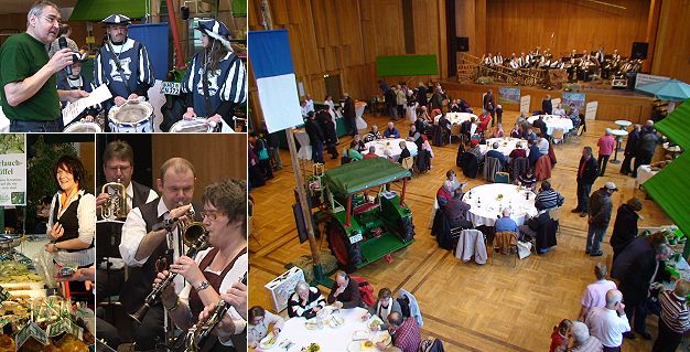Allerlei Angebote mit dem würzigen Lauchkraut Markttreiben in der Stadthalle. Links oben Rolf Wieprecht bei der Markteröffnung mit Fanfarenzug-Mitgliedern, Unten ein Marktstand und Musikanten der Gammelsbacher Blaskapelle. (Fotos: Hubert Richter)Mehr Bilder (Klicken zum Vergrößern):