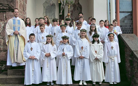 Aufnahme in die Mahlgemeinschaft mit Gott und der Gemeinde (Foto: privat)(bro) (hn) Am "Weißen Sonntag", erster Sonntag nach Ostern, durften in Hirschhorn 18 Kinder zum ersten Mal die "Heilige Kommunion" empfangen. Das Thema der Vorbereitungszeit hieß "Bleib in unserem Haus" und erinnerte an die Emmaus-Jünger, die Jesus erkannten, als er in ihrem Haus mit ihnen das Brot brach.