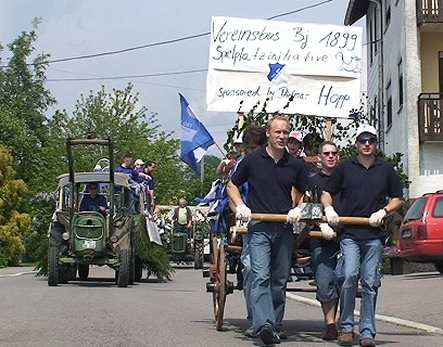 Am heutigen Kerweumzug, der vom Musikverein Reichartshausen begleitet wurde, beteiligten sich unter dem Dach des Kerwevereins mehrere Gruppen und Vereine zu Fuß oder mit Motivwagen (unsere Bilder). Eine Jury wählte dann die schönsten Wagen aus. Auf Platz eins kam die Gruppe Knapp/Schäfer mit ihrem Thema "Wir sind Dorfkinder", gefolgt von zwei Zugnummern der Spielplatzinitiative.