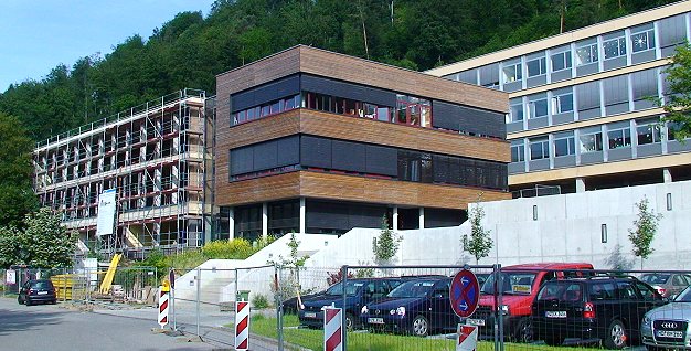 Die Umbauarbeiten an dem talseitigen Schulgebäude mit Mensa und Verwaltungsbereich sollen bis zum Schuljahresbeginn 2009/2010 fertiggestellt werden. Auf Eis gelegt seien aber zunächst der beschlossene Umbau der Aula und der Anbau der eingehausten Außentreppe (wir berichteten) sowie weitere Maßnahmen am mittleren Trakt des HSG (rechts im Bild), sagte Manfred Janner.