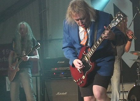 Höhepunkt des Jubelwochenendes war dann am Abend ein Rockfestival im Festzelt mit einer der angesagtesten AC/DC-Coverbands der Region. "AC/ID" schafften es in einer über zweistündigen Show, die Fans der australischen Hardrocker zu begeistern. Die Band kam dem Original sowohl soundmäßig als auch mit ihrer Performance ziemlich nahe. Sologitarrist Ralf Keßler gab in der Schuluniform mit kurzen Hosen eine überzeugende Angus-Young-Kopie, legte wie sein Vorbild einen Striptease hin und bahnte sich anschließend für sein Gitarrensolo den Weg durchs Publikum. Frontmann Joe Strubel ließ vor allem den verstorbenen ersten AC/DC-Sänger Bon Scott wiederauferstehen, hatte aber stimmlich auch mit den Songs von Brian Johnson einschließlich der neuen Single "Rock ´n´ Roll Train" keine Probleme. Bassist Stefan Schiemer und Drummer Jens Gellner sorgten für den beinharten AC/DC-Rhythmus. Geboten wurden alle Hits der Australier von den Anfängen in den 1970er Jahren bis heute.