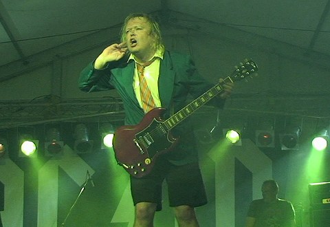 Höhepunkt des Jubelwochenendes war dann am Abend ein Rockfestival im Festzelt mit einer der angesagtesten AC/DC-Coverbands der Region. "AC/ID" schafften es in einer über zweistündigen Show, die Fans der australischen Hardrocker zu begeistern. Die Band kam dem Original sowohl soundmäßig als auch mit ihrer Performance ziemlich nahe. Sologitarrist Ralf Keßler gab in der Schuluniform mit kurzen Hosen eine überzeugende Angus-Young-Kopie, legte wie sein Vorbild einen Striptease hin und bahnte sich anschließend für sein Gitarrensolo den Weg durchs Publikum. Frontmann Joe Strubel ließ vor allem den verstorbenen ersten AC/DC-Sänger Bon Scott wiederauferstehen, hatte aber stimmlich auch mit den Songs von Brian Johnson einschließlich der neuen Single "Rock ´n´ Roll Train" keine Probleme. Bassist Stefan Schiemer und Drummer Jens Gellner sorgten für den beinharten AC/DC-Rhythmus. Geboten wurden alle Hits der Australier von den Anfängen in den 1970er Jahren bis heute.