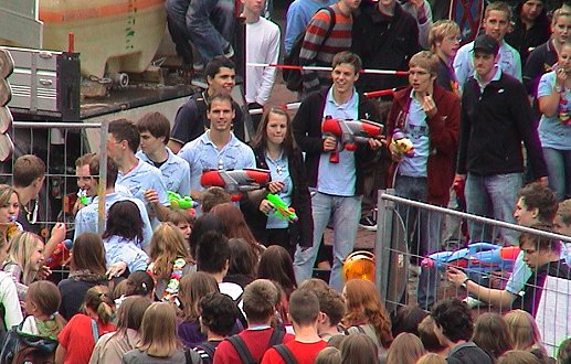 Und dann ging alles ganz schnell: Die Lehrkräfte wurden kurzerhand zu den vor dem Lehrerzimmer warteten Stewardessen geleitet und zu einem Sektumtrunk genötigt. Die Schüler und Schülerinnen mussten das Schulgebäude durch ein Sicherheitstor verlassen, an welchen zahlreiche Wachposten mit Wasserspritzpistolen ihre Arbeit sehr genau nahmen. Auf dem Sportgelände wurde anschließend bis nach 13 Uhr die Beachparty 2009 mit fetziger Musik und witzigen Spielen gefeiert.