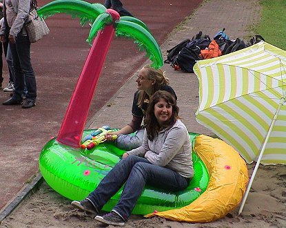 Und dann ging alles ganz schnell: Die Lehrkräfte wurden kurzerhand zu den vor dem Lehrerzimmer warteten Stewardessen geleitet und zu einem Sektumtrunk genötigt. Die Schüler und Schülerinnen mussten das Schulgebäude durch ein Sicherheitstor verlassen, an welchen zahlreiche Wachposten mit Wasserspritzpistolen ihre Arbeit sehr genau nahmen. Auf dem Sportgelände wurde anschließend bis nach 13 Uhr die Beachparty 2009 mit fetziger Musik und witzigen Spielen gefeiert.
