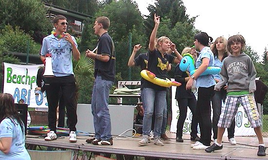 Und dann ging alles ganz schnell: Die Lehrkräfte wurden kurzerhand zu den vor dem Lehrerzimmer warteten Stewardessen geleitet und zu einem Sektumtrunk genötigt. Die Schüler und Schülerinnen mussten das Schulgebäude durch ein Sicherheitstor verlassen, an welchen zahlreiche Wachposten mit Wasserspritzpistolen ihre Arbeit sehr genau nahmen. Auf dem Sportgelände wurde anschließend bis nach 13 Uhr die Beachparty 2009 mit fetziger Musik und witzigen Spielen gefeiert.