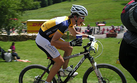 Erstes Rennen nach zweijähriger Pause Alessandro Sepp betätigt sich als Wasserträger für seine Schwester Julia, die nach einer zweijährigen Pause ihr erstes Rennen absolvierte. (Foto: T. Sepp)(hof) (ts) Am vergangenen Wochenende fand in Kirchzarten der traditionelle Ultra-Bike-Marathon statt. Der Samstag stand dabei ganz im Zeichen des Bundesliga-Nachwuchssichtungsrennens, an dem auch Alessandro Sepp vom VfR Waldkatzenbach am Start war. Sonntags gingen die Biker den MTB-Marathon an. Für die Winterhauchbiker gingen die Geschwister Alessandro und Julia Sepp als Team ins Rennen.