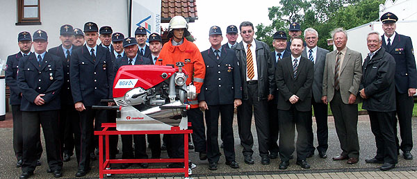 (tb) Für die Mitglieder der Freiwilligen Feuerwehr Weisbach war am Sonntag wohl der Höhepunkt des diesjährigen Brunnenfestes oder vielmehr des laufenden Jahres. Nachdem die Wehr im Jahre 2006 schon den MTW – TS (Mannschaftstransportwagen mit Tragkraftspritze) einweihen konnte, wurde heute - ermöglicht durch eine Spende des Badischen Gemeindeversicherungsverbandes (BGV) - eine neue, leistungsstarke Tragkraftspritze des Typs Rosenbauer Fox III in Dienst gestellt, die das mittlerweile exakt 50 Jahre alte Modell ablöst und als Waldbrunns leistungsstärkste Tragkraftspritze gilt.