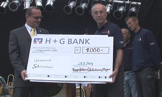 Auf der Bühne im Schulhof fand heute Abend ein Konzert verschiedener Schönbrunner Chöre und des Handharmonika-Clubs Haag statt. Zuvor stand am Nachmittag eine Tanzshow der Jazz-Dance-Abteilung des SV Moosbrunn auf dem Programm. Die Kurpfälzer Gleitschirmflieger, die auf dem Schleppgelände zwischen Schönbrunn und Haag morgen wieder Tandemflüge anbieten, spendeten der Gemeinde heute 1.000 Euro, den Erlös aus der Eröffnungsveranstaltung der Gleitschirmstrecke im März (wir berichteten). Das Geld soll in den gemeinnützigen "Fonds fürs Leben" fließen. Auch der Erlös aus der Gesamtveranstaltung "Lebendiges Schönbrunn" ist für gemeinnützige Zwecke gedacht, nämlich für den Ortsverein des DRK, die kommunalen Kindergärten und die örtliche Grundschule.