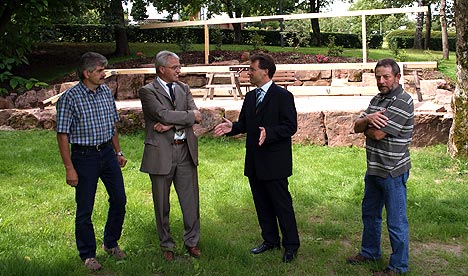 Dorffest im Kurpark Mülben Gemeinsam mit Bürgermeister Klaus Schölch (2.v.l.), Ortsvorsteher Peter Ihrig (r.), Kämmerer Joachim Gornik (l.) besichtigte Landrat Dr. Achim Brötel (2.v.r.) die Naturbühne im Kurpark Mülben. (Foto: Hofherr)(hof) Am kommenden Wochenende feiert Mülben das traditionelle Dorffest im Kurpark. Höhepunkt ist in diesem Jahr die Einweihung der neuen Naturbühne, die in vielen ehrenamtlichen Helferstunden in den letzten Monaten, auch mit Geldern der EU, entstanden ist.