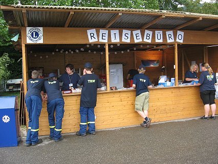 Es war schon eine logistische Meisterleistung, die der THW-Ortsverband Eberbach unter der Leitung seines Ortsbeauftragten Ulrich Schaffer mit seinen vielen Helfern auf die Beine gestellt hatte. Am Samstag wurde auf dem Busparkplatz am Neckarlauer ein Meldekopf eingerichtet, um von hier aus die angereisten Ortsgruppen nach und nach auf den Lagerplatz in die Au zu lotsen. Aufbauleiter und Platzwart Achim Link zeigte den angereisten Gruppen dort dann ihre zugeteilten Lagerplätze, und seine Helfer sorgten anschließend dafür, dass die Fahrzeuge wieder schnell den Lagerplatz verließen. Eine richtige kleine Stadt ist hier entstanden, mit einem Reisebüro, in dem Ausflüge gebucht werden können, der täglich erscheinenden Lagerzeitung „Die Wildsau“, einem kleinen Kiosk, in dem Eis und Süßes gekauft oder Spiele ausgeliehen werden können sowie einer Feldküche, die für die Verpflegung der Teilnehmer verantwortlich ist.