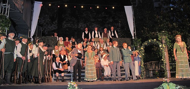 Mit heiterer Musik zwischen Komik und Gesellschaftskritik (Foto: Barbara Nolten-Casado)(hr) (bnc) Am Freitag, 14. August, wird um 20 Uhr mit Albert Lortzings komischer Oper "Der Wildschütz" die dritte große Produktion der diesjährigen Zwingenberger Schlossfestspiele Premiere feiern. Und was dem "Freischütz" die Wolfsschlucht, das ist dem "Wildschütz" Dorf und Schloss des Grafen von Eberbach: Eine gewisse Portion Lokalkolorit, die das heitere Biedermaier-Singspiel nach Ansicht von Intendant Karsten Huschke "wie für Burg Zwingenberg gemacht" erscheinen lässt.