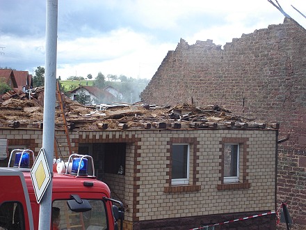 Durch die in der Scheune gelagerten Heuballen brannte das Gebäude lichterloh. Kurz nach Eintreffen der ersten Feuerwehrkräfte stürzte der Dachvorsprung der Scheune auf die Straße. Ein Giebel drohte auf ein benachbartes Gebäude zu fallen. Er wurde im Laufe des Einsatzes mithilfe eines Baggers und eines Forstschleppers kontrolliert abgetragen. Heu wurde aus der Scheune gebracht und auf eine Wiese zum Nachlöschen tranportiert. Um alle Brandnester zu erreichen, musste das Gebäude während der Löscharbeiten bis auf die Grundmauern abgetragen werden. Auch landwirtschaftliche Geräte in der Scheune wurden zerstört.