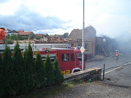 Durch die in der Scheune gelagerten Heuballen brannte das Gebäude lichterloh. Kurz nach Eintreffen der ersten Feuerwehrkräfte stürzte der Dachvorsprung der Scheune auf die Straße. Ein Giebel drohte auf ein benachbartes Gebäude zu fallen. Er wurde im Laufe des Einsatzes mithilfe eines Baggers und eines Forstschleppers kontrolliert abgetragen. Heu wurde aus der Scheune gebracht und auf eine Wiese zum Nachlöschen tranportiert. Um alle Brandnester zu erreichen, musste das Gebäude während der Löscharbeiten bis auf die Grundmauern abgetragen werden. Auch landwirtschaftliche Geräte in der Scheune wurden zerstört.