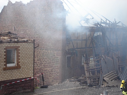 Durch die in der Scheune gelagerten Heuballen brannte das Gebäude lichterloh. Kurz nach Eintreffen der ersten Feuerwehrkräfte stürzte der Dachvorsprung der Scheune auf die Straße. Ein Giebel drohte auf ein benachbartes Gebäude zu fallen. Er wurde im Laufe des Einsatzes mithilfe eines Baggers und eines Forstschleppers kontrolliert abgetragen. Heu wurde aus der Scheune gebracht und auf eine Wiese zum Nachlöschen tranportiert. Um alle Brandnester zu erreichen, musste das Gebäude während der Löscharbeiten bis auf die Grundmauern abgetragen werden. Auch landwirtschaftliche Geräte in der Scheune wurden zerstört.