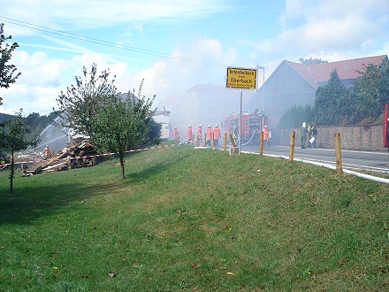 Durch die in der Scheune gelagerten Heuballen brannte das Gebäude lichterloh. Kurz nach Eintreffen der ersten Feuerwehrkräfte stürzte der Dachvorsprung der Scheune auf die Straße. Ein Giebel drohte auf ein benachbartes Gebäude zu fallen. Er wurde im Laufe des Einsatzes mithilfe eines Baggers und eines Forstschleppers kontrolliert abgetragen. Heu wurde aus der Scheune gebracht und auf eine Wiese zum Nachlöschen tranportiert. Um alle Brandnester zu erreichen, musste das Gebäude während der Löscharbeiten bis auf die Grundmauern abgetragen werden. Auch landwirtschaftliche Geräte in der Scheune wurden zerstört.