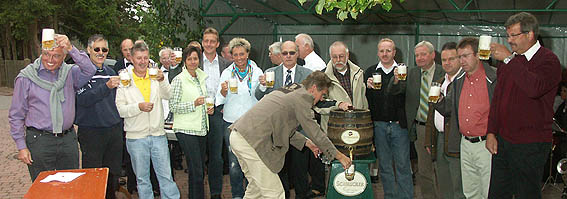 Nach dem Fassanstich folgte Regen Auf einen guten Verlauf beim Waldkatzenbacher Dorffest stießen Schirmherr Bürgermeister Klaus Schölch (links), Ortsvorsteher Karlheinz Wetterauer (Mitte) und die Ehrengäste an. (Foto: Thomas Baumgartner)(tb) Mit drei Schlägen stach Schirmherr und Bürgermeister Klaus Schölch gestern das erste Bierfass zum Waldkatzenbacher Dorffest am Platz unter der historischen Dorflinde an. Nach einem Musikstück der Feuerwehrkapelle Waldkatzenbach begrüßte zunächst Ortsvorsteher Karlheinz Wetterauer zum Festauftakt unter den Gästen auch viele Gemeinde –und Ortschaftsräte sowie die Kreisräte Norbert Bienek und Ralf Schnörr, seines Zeichen auch Bürgermeister von Neckargerach.