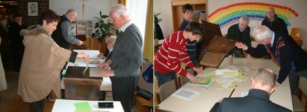 Katholiken wählten ihre Vertreter Das Wahllokal im Pfarrheim von St. Johannes Nepomuk heute morgen. Die Wahlhelfer in der Unterkirche von St. Josef bereiten nach Schließung des Wahllokals die Stimmauszählung vor. (Fotos:Wörner)(hr) Gestern und heute waren die Katholiken in der Erzdiözese Freiburg aufgerufen ihre Pfarrgemeinderäte zu wählen.