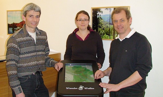 Wanderwalter weist den Weg "Wanderwalter"-Erfinder Hardy Wieland (r.) stellte gemeinsam mit Naturpark-Geschäftsführer Manfred Robens und Praktikantin Maria Hartwig die Software in Eberbach vor. (Foto: Claudia Richter)