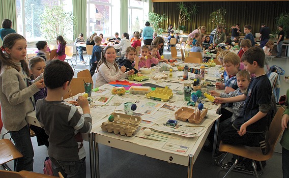 Spaß beim Basteln, Werken und Backen (Foto: privat)(bro) (bs) Die Osterwerkstatt der katholischen Jugend unter der Leitung von Verena Kurth und Christina Münch war auch in diesem Jahr wieder ein Erfolg: Etwa 70 Kinder folgten der Einladung in die Unterkirche St. Josef zum Basteln, Werken und Backen. An vielfältigen Stationen bemalten die Kinder Eier, bastelten Eierbecher und Osternester, verwandelten abgesägte Baumstämmchen in Hasen oder Hühner. Sehr beliebt waren auch wieder das Osterhasenbacken und die Laubsägearbeiten. Am Ende konnten die Kinder viele gelungene Ergebnisse mit nach Hause nehmen.