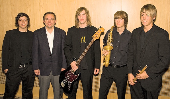 Benedikt Held erhält den Preis der Werner Stober Stiftung V. li.: Jesse Safferling, Musiklehrer Dieter Kaiser, Benedikt Held, Fabian Held und Patrick Mühlfeld (Foto: Andreas Held).(bro) (stb) Benedikt Held bekam am 15. Juni in Karlsruhe den Preis der Werner Stober Stiftung verliehen für sein außergewöhnliches Engagement im Fachbereich Musik. Dieser Musikpreis wird jährlich Schülern der Gymnasien mit Musikprofil für besondere Leistungen aus der Werner Stober Stiftung gespendet.