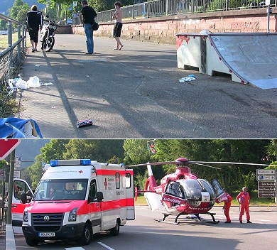 16-Jähriger erlitt Kopfverletzungen (Fotos: Hubert Richter)(hr) Schwer verletzt wurde heute ein 16-jähriger Waldbrunner bei einem Unfall an der Skateranlage.
