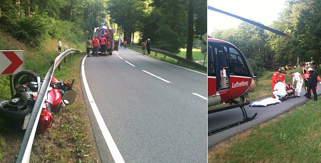 Sturz auf der B 45 (Fotos: Hubert Richter)(hr) Schwere Verletzungen erlitt ein 18-jähriger Motorradfahrer aus dem Kreis Darmstadt-Dieburg heute Abend bei einem Unfall auf der B 45 zwischen Beerfelden und Gammelsbach.