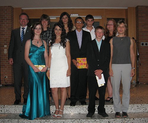 Im Anschluss erhielten die Absolventinnen und Absolventen ihre Abschlusszeugnisse. Die Prüfungsbesten aus der 9a mit einem Notendurchschnitt von jeweils 2,3 sind: Marvin Layer, Cem Yorulmaz, Ayse Eryilmaz und Serap Sabankiran. Aus der 9b erreichte Ayoub Brissa einen Notendurchschnitt von 1,8 und Jasmin Marx aus der 10.Klasse legte ihre Prüfung mit der Note 2,1 ab. Aus den Händen von Bürgermeister Bernhard Martin erhielten die Prüfungsbesten auch einen Ehrenpreis der Stadt Eberbach. Für ihre Mitarbeit bei der SMV erhielten Maria Holzmann und Steven Kaufmann eine Anerkennung ebenso die Schülermentoren Renato Marci, Sevde Algir und Maria Holzmann. Hans-Jörg Köhler aus den Reihen der Elternschaft erhielt von Rektorin Strämke ein kleines Geschenk für zehn Jahre „Dienst“ als Elternbeiratsvorsitzender.