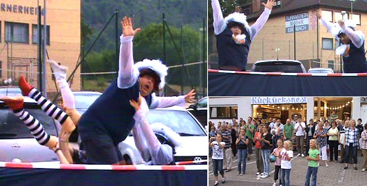 Das Ergebnis monatelangen Trainings präsentierten Geilsdörfer und Moll am vergangenen Wochenende bei einem Grillfest vor dem Vereinsheim Kuckucksnest. Dank technischer Möglichkeiten und fast ohne Schummeln meisterte das Gardepaar sowohl den Marschtanz als auch die Hebefiguren ohne Verletzung überzeugend. Der im Februar versprochene Auftritt der "weißen Funken" fand aus ungeklärten Gründen nicht statt. Dennoch wurde im Anschluss an die Tanzdarbietung des Präsidenten und des Elfers in großer Runde bei Spanferkel und kühlen Getränken noch lange fachmännisch über den gelungenen Auftritt diskutiert.