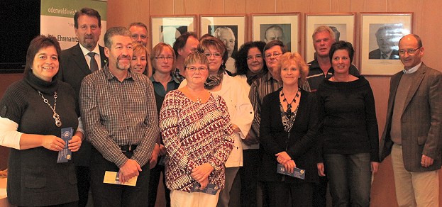 Kleine Anerkennung auch für die Interessengruppe Schwimmbad Hetzbach Fleißige Helfer, die sich für den Erhalt des Schwimmbades in Beerfelden Hetzbach eingesetzt haben und dort nach wie vor vielerlei Arbeit ehrenamtlich leisten, erfuhren kürzlich in Erbach Anerkennung für ihr Engagement: Landrat Dietrich Kübler überreichte ihnen die Ehrenamtskarte. Dazu nahmen sie auch die Glückwünsche und den Dank von Beerfeldens Bürgermeister Görig (re.) entgegen. (Foto: privat)(bro) (wb) Im Landratsamt in Erbach hat Landrat Dietrich Kübler dieser Tage in einer Feierstunge 38 Ehrenamtskarten, eine Jugendleiter-Card (Juleica) und fünf Urkunden an Sponsoren überreicht, die für E-Card- oder Juleica-Inhaber Vergünstigungen gewähren. Kübler dankte allen Ehrenamtlichen für deren uneigennützigen Einsatz.