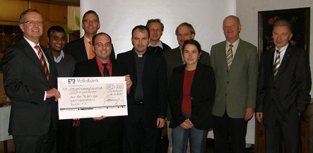 Symbolische Scheckübergabe an die Kirchengemeinden Vorstandsvorsitzender Ekkehard Saueressig (1.v.l.), die anwesenden Pfarrer - stellvertretend für die Vertreter der Kirchengemeinden - sowie der Generalbevollmächtigten Günter Apeltauer (1.v.r). (Foto: privat)