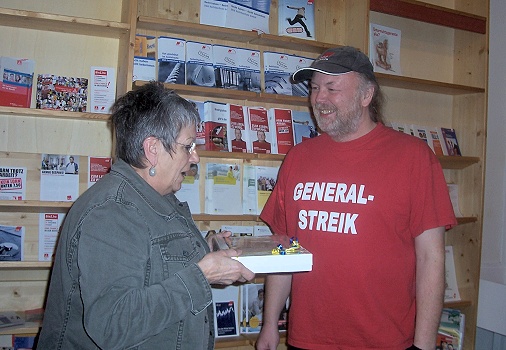 Präsents und der besten Wünsche der Stadt Hirschhorn an Stefan Riedel, Vorsitzender des DGB Ortsverbands. (Foto: privat)(bro) (str) Das neue Gewerkschaftsbüro in Hirschhorn befindet sich in der Hauptstraße 34 mitten in der Fußgängerzone. Das Büro, das gemeinsam von DGB, IG Metall und ver.di getragen wird, löst das seit mehreren Jahren in Hirschhorn aktive DGB-Informationsbüro ab.