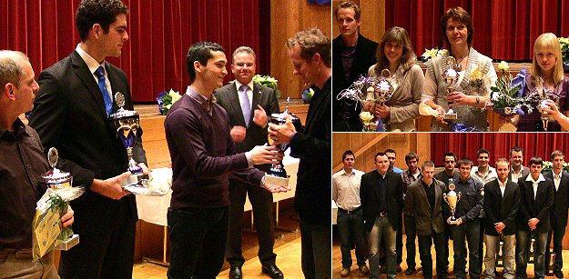 Zweistündiger Ehrungsmarathon in der Stadthalle Links: V.l. Christoph Diehl, Simon Schiml und der "Sportler des Jahres" Wladislaw Gumarow, der von Timo Bracht den Pokal erhält. Rechts oben Timo Bracht mit der "Sportlerin des Jahres" Angelika Merkel sowie den Platzierten Kerstin Liebsch und Maria Schneider (v.l.). Unten die "Mannschaft des Jahres" von der HGE. (Fotos: Hubert Richter)Mehr Bilder (Klicken zum Vergrößern):