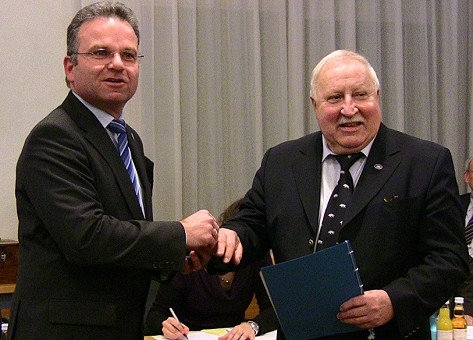 Seit 25 Jahren im Stadtparlament Hohe Ehrung für Dieter Jeitner (r.) durch Bürgermeister Bernhard Martin. (Foto: Hubert Richter)(hr) SPD-Stadtrat Dieter Jeitner wurde heute für seine langjährige ehrenamtliche Tätigkeit mit dem Ehrenring der Stadt Eberbach in Gold ausgezeichnet.