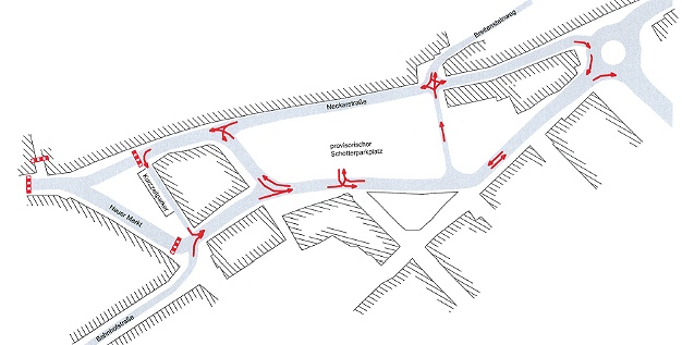 In der ersten Phase ab der kommenden Woche kann der Verkehr aus der Bahnhofstraße über die Brückenstraße abfahren. Der provisorische Schotterparkplatz kann vom Kreisverkehr kommend über die Brückenstraße an- und abgefahren werden. Sobald es der Baufortschritt zulässt, sollen auf der Ostseite des Neuen Markts Kurzzeitparkplätze eingerichtet werden. Die Parkplätze können dann über die Querspange Brückenstraße angefahren und über die verlängerte Bahnhofstraße abgefahren werden. Unsere Grafik zeigt die entsprechende Verkehrsführung.