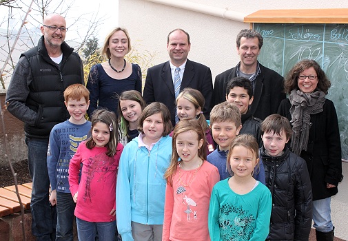 Sanierung und Neugestaltung bringen auch optischen Gewinn Nach der Neugestaltung des Pausenhofs der Grundschule Rothenberg ließen sich Mitarbeiter des Eigenbetriebes Bau- und Immobilienmanagements (Bimo) des Odenwaldkreises von Schulleiterin Angela Assmann mit einigen Schülerinnen und Schülern den verschönerten Außenbereich zeigen. Dabei waren Inge Heusel, Rüdiger Braner, Bimo-Leiter Oliver Grobeis und Werner Belzer (hintere Reihe v. re.). (Foto: privat)(bro) (bg) Fröhliches Kindergeschrei begrüßte am 16. März die Delegation aus dem Bau- und Immobilienmanagement (Bimo) des Odenwaldkreises in der Grundschule Rothenberg und bot so den besten Beweis für eine gelungene Baumaßnahme: Der Pausenhof der Schule wurde komplett neu gestaltet.