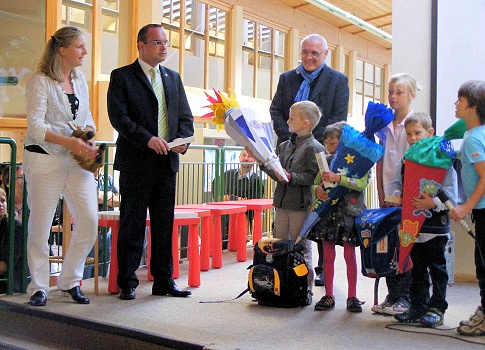 Nach dem Gottesdienst, der liebevoll gestaltet wurde, machten sich die ABC-Schützen auf den Weg ins Schulhaus. Hier erwartete sie und ihre Eltern, Großeltern, Paten und Bekannte ein abwechslungsreiches Programm. Die Kinder der Eingangsstufe begrüßten ihre neuen Mitschüler mit zwei Flötenstücken. Eine Präsentation sowie eine Ansprache des Rektors Karlfried Schicht zauberte so manches Lächeln auf viele Gesichter. Im Anschluss präsentierte die Aufbaustufe ein heiteres Theaterstück, das von einem Mädchen handelte, das ebenfalls neu an die Bildungswerkstatt Schönbrunn kam. In ihren kurzen Ansprachen betonten die Vertreter der Elternschaft, des Fördervereins sowie der Gemeinde, Bürgermeister Frey, die Wichtigkeit einer intakten und einfühlsamen Lernumgebung und einer ineinandergreifenden Zusammenarbeit untereinander, wie sie an der Bildungswerkstatt geradezu vorbildlich umgesetzt wird. Die „alten Hasen“ der drei Lerngruppen der Eingangsstufe begrüßten mit ihren Lehrerinnen ihre neuen „jungen Hüpfer“ herzlich und begleiteten sie in ihre erste Unterrichtsstunde. Derweil ließen die Erwachsenen den aufregenden Morgen bei einem kleinen Umtrunk, welcher vom Förderverein ausgerichtet wurde, auf dem Schulhof ausklingen.