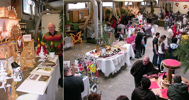 In der umgeräumten Werkstatt präsentieren rund 30 Aussteller aus der Region vor allem kunsthandwerkliche Produkte. Daneben gibt es kulinarische Köstlichkeiten und weihnachtliche Bücher.