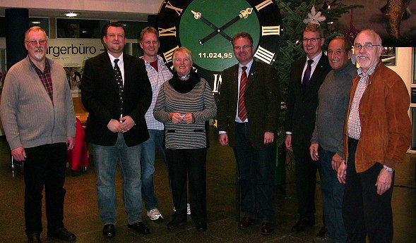 Fastnachter erhöht auf 11.111,11 Euro Freuen sich über den Sammelerfolg: Dieter Müller, Jens Müller, Dirk Müller, Christa Wernz, Bernhard Martin, Karlheinz Emig, Manfred Wernz und Günter Lipski(v.l.) (Foto: Claudia Richter)(cr) Die Spendensammelaktion der Bürger- und Heimatvereins (BHV) für die Sanierung der Zifferblätter an der Turmuhr der Eberbacher Michaelskirche ist abgeschlossen (wir berichteten). Heute überreichte der Vorstand des Vereins das Geld an Bürgermeister Bernhard Martin.