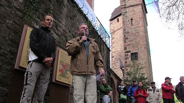 Mit dabei waren neben Eberbachs Bürgermeister Bernhard Martin und dem Ideengeber für den Neckarsteig, Top-Triathlet Timo Bracht, auch die Landräte Stefan Dallinger (Rhein-Neckar-Kreis) und Dr. Achim Brötel (Neckar-Odenwald-Kreis), zahlreiche weitere Bürgermeister sowie der Verbandsdirektor der Metropolregion Rhein-Neckar, Ralph Schlusche.