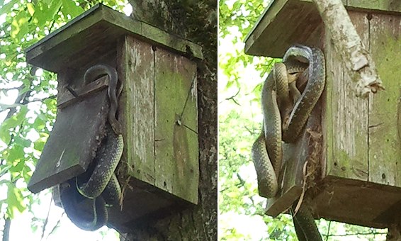 Äskulapnattern beim Paarungsspiel fotografiert (Fotos: privat)(hr) Ein seltenes Naturschauspiel konnte heute eine Leserin unseres Online-Magazins beobachten: Schlangen beim Paarungsspiel an einem Vogelnistkasten.