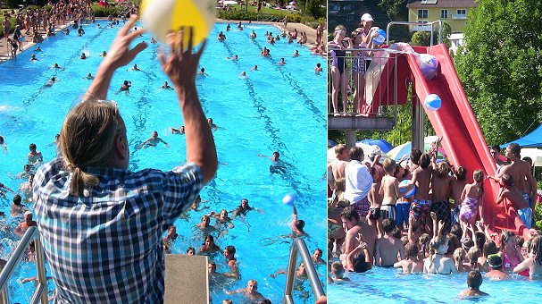 Werbeartikel bei hochsommerlichen Temperaturen heiß begehrt (Fotos: Hubert Richter)(hr) Die heißen Temperaturen bei strahlendem Sonnenschein bescheren dem Eberbacher Freibad dieser Tage enormen Zulauf. Passend dazu verteilte die Eberbacher Werbegemeinschaft (EWG) gestern Nachmittag rund 100 Wasserbälle an die Badegäste.