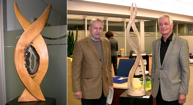 Künstlerische Symbiosen aus Holz und Stein Bernhard Grimm (r.) mit Laudator Hans Hermann Grimm bei der Ausstellungseröffnung. (Fotos: Claudia Richter)(cr) In der Eberbacher Hauptstelle der Volksbank Neckartal ist zurzeit eine Ausstellung mit Exponaten aus Holz, Stein und Edelstein von Bernhard Grimm zu sehen.