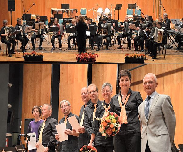 Ein gelungenes Jubiläumskonzert Oben: Das erste Orchester des AOE. Unten: Ehrungen des Deutschen Harmonikaverbandes v.l.: Johannes Lamprecht, Josef Nehmet, Peter Prinz, Klaus Gärtner, Stefan Schmidt, Iris Heß, Beate Rudolf, DHV Karl-Heinz Strohmaier. (Fotos: privat)(bro) (ub) Zu seinem sechzigsten Geburtstag lud das Akkordeon-Orchester Eberbach e.V. am 6. Oktober in die Eberbacher Stadthalle ein.