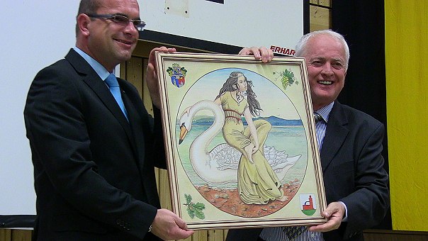 Drei Festtage für ein dreiviertel Jahrtausend Ortsgeschichte V.l. Schönbrunns Bürgermeister Jan Frey und Bürgermeister Josef Takaz aus Balatonszemes mit einem Gastgeschenk der Partnergemeinde aus Ungarn. (Foto: Hubert Richter)Mehr Bilder (Klicken zum Vergrößern):