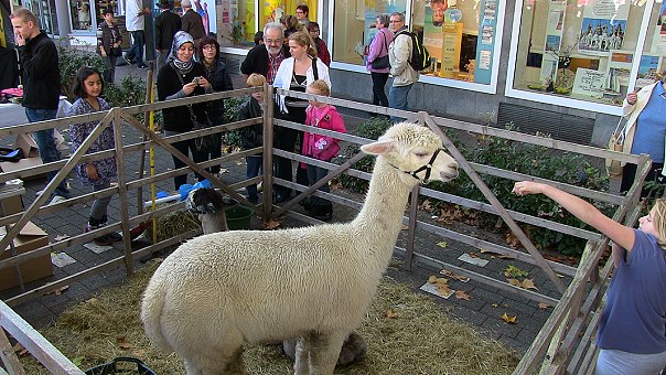 Traditionelles Herbstfest im Wetterglück - Kreativmarkt in der Stadthalle Alpakas auf dem Bahnhofsplatz. (Foto: Hubert Richter)Mehr Bilder (Klicken zum Vergrößern):
